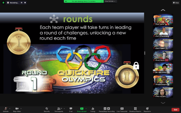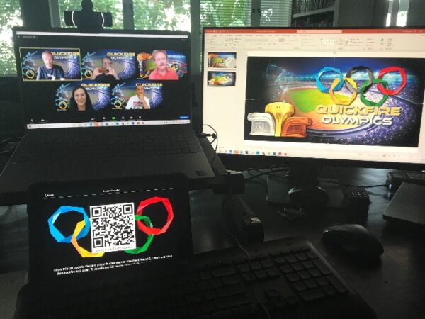 Quickfire Olympics Online challenges teams with mental, creative, multiple-choice, and photo tasks led by rotating team captains. Players earn points by completing challenges thoughtfully and creatively. Success depends on strategy, collaboration, and leadership as teams compete to score the highest points within the time limit.
